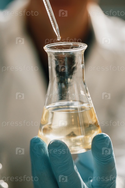 Масло из конопли CBD, ученый держит бутылку масла каннабиса против растения марихуаны