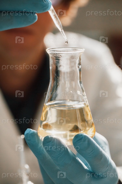 Масло из конопли CBD, ученый держит бутылку масла каннабиса против растения марихуаны