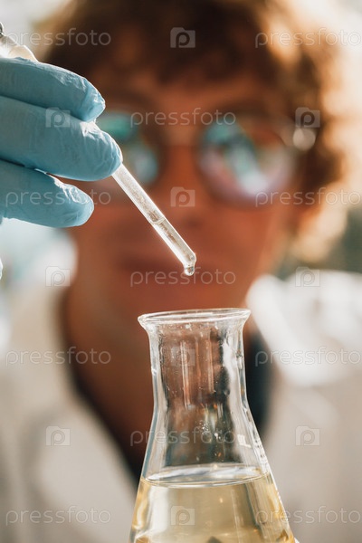 Масло из конопли CBD, ученый держит бутылку масла каннабиса против растения марихуаны