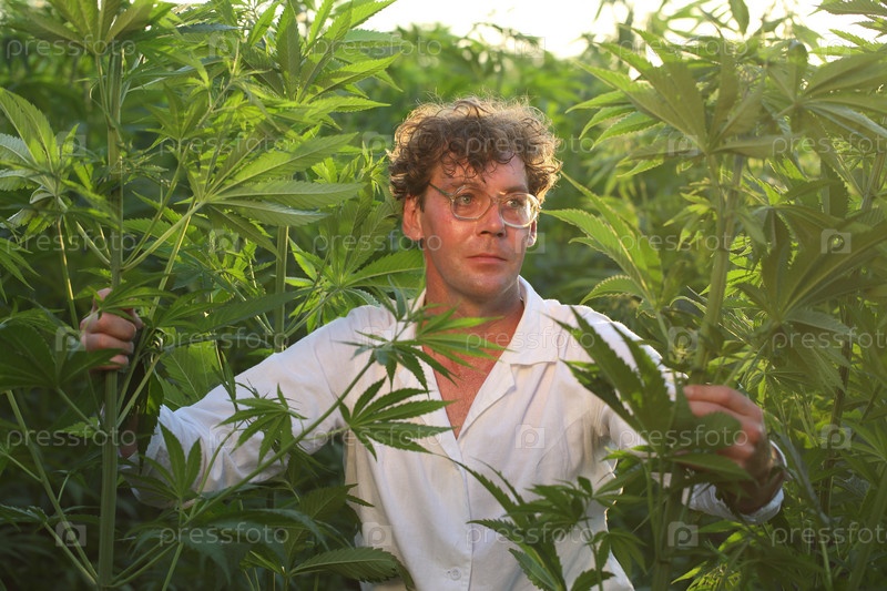 Ученый биолог работает в конопляном поле
