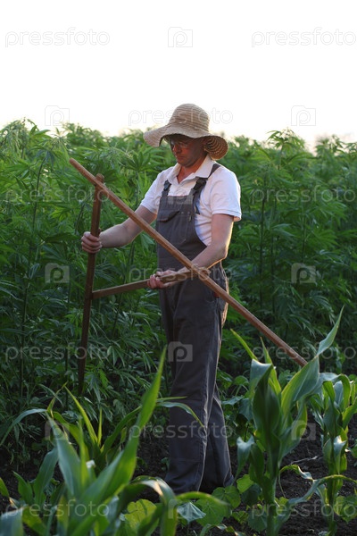 Фермер работает на конопляном поле. Срезает лишние растения серпом
