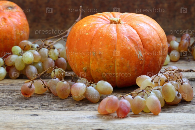 Натюрморт с тыквами,виноградом и веткой калины