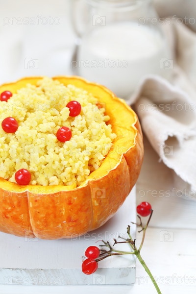 Ходячая каша с тыквой и молоком на белом фоне