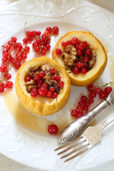 Печеные яблоки с медом, грецкими орехами, смородиной на белом фоне