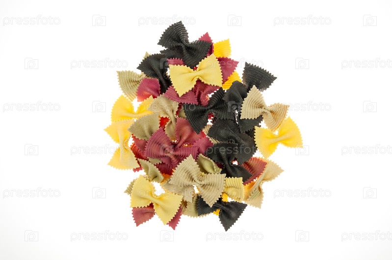 Куча красочных макарон в виде бабочек на белом фоне