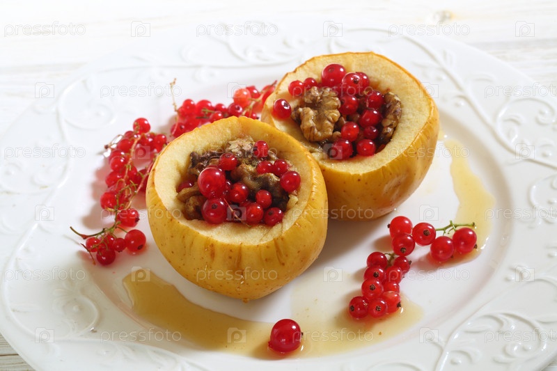 Печеные яблоки с медом, грецкими орехами, смородиной на белом фоне