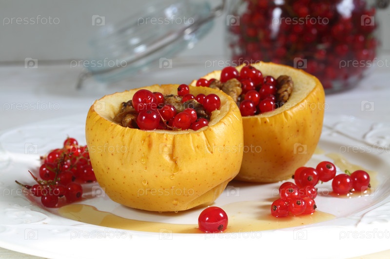Печеные яблоки с медом, грецкими орехами, смородиной на белом фоне