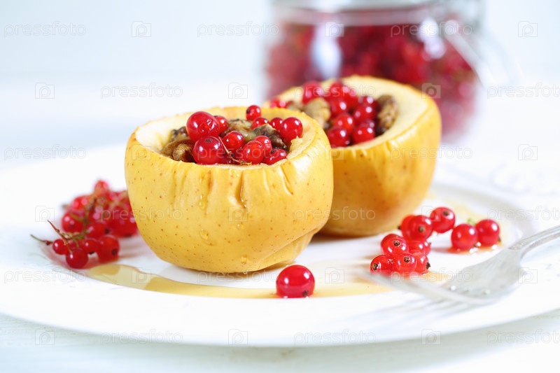 Печеные яблоки с медом, грецкими орехами, смородиной на белом фоне