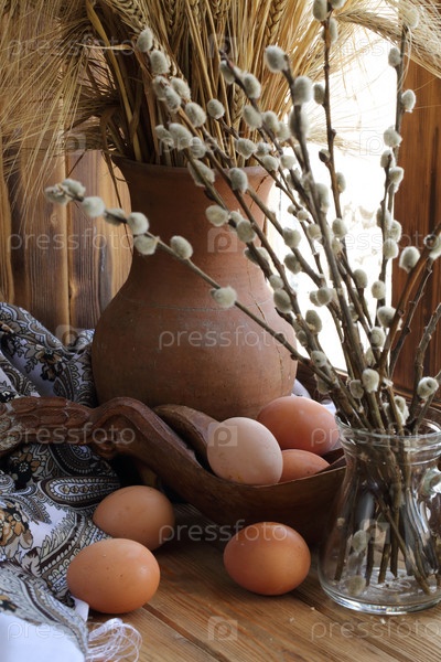 Пасхальный натюрморт с ивой, пшеницей, крашеными яйцами на деревянном фоне