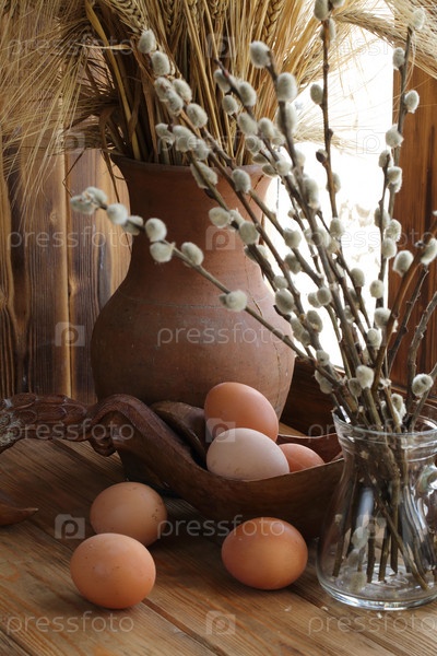 Пасхальный натюрморт с ивой, пшеницей, крашеными яйцами на деревянном фоне