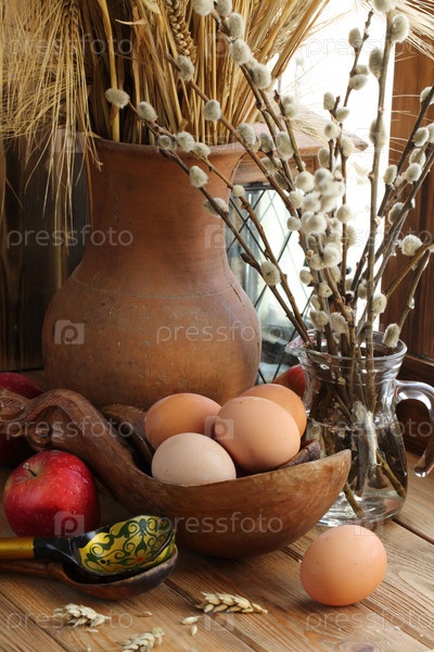 Пасхальный натюрморт с ивой, пшеницей, крашеными яйцами на деревянном фоне