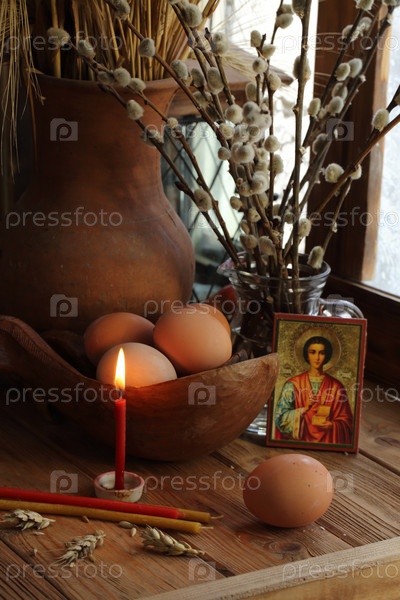 Пасхальный натюрморт с ивой, пшеницей, крашеными яйцами на деревянном фоне