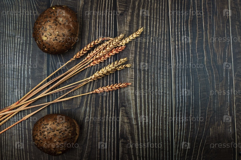Куча колосьев пшеницы и свежие булочки для гамбургеров на деревянном фоне. Концепция пекарни