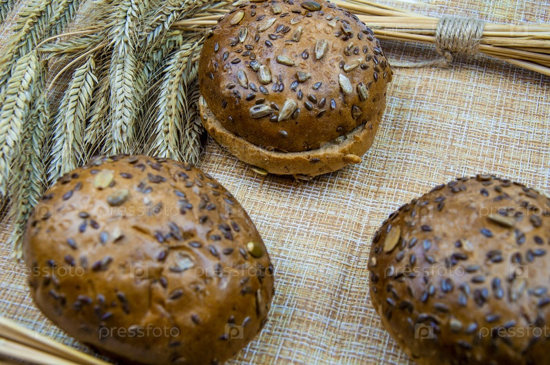 Вкусные ржаные булочки со спелыми ржаными колосьями на мешковине. почему еда