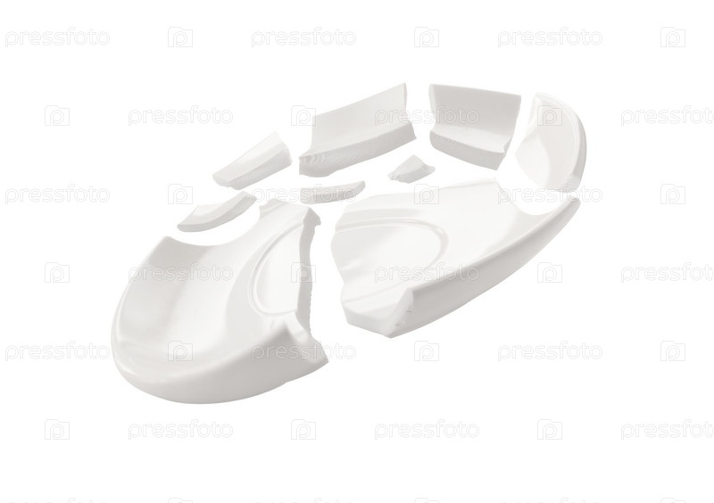 Вид сбоку разбитой тарелки на белом фоне. Разбитое блюдо