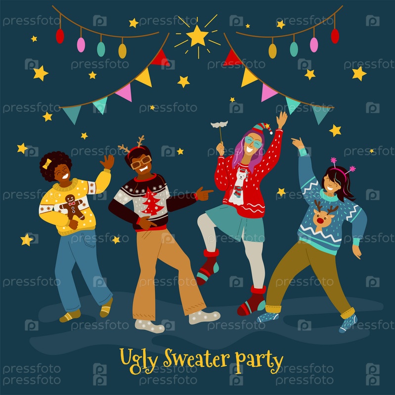 Уродливая вечеринка в свитере. Танцуют молодые люди в рождественских свитерах