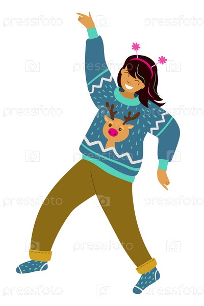Девушка танцует в уродливом свитере с рождественским оленем