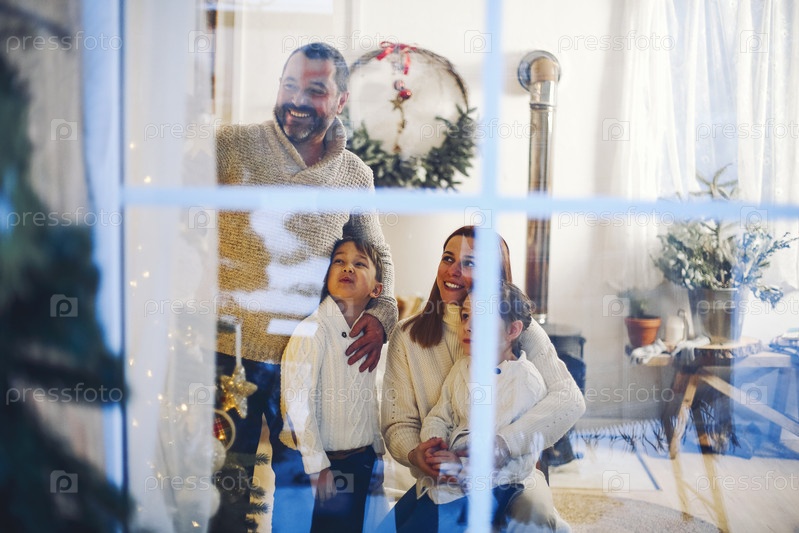 Рождественское время. Счастливая семья с двумя маленькими детьми собралась у окна дома, украшая елку