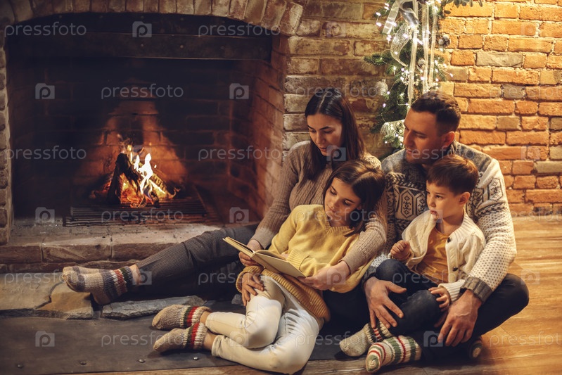 Счастливая европейская семья с детьми сидит на полу у камина, читает и жарит зефир на огне