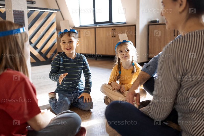 Счастливая молодая семья с детьми, играющими в карты дома, сидя на полу