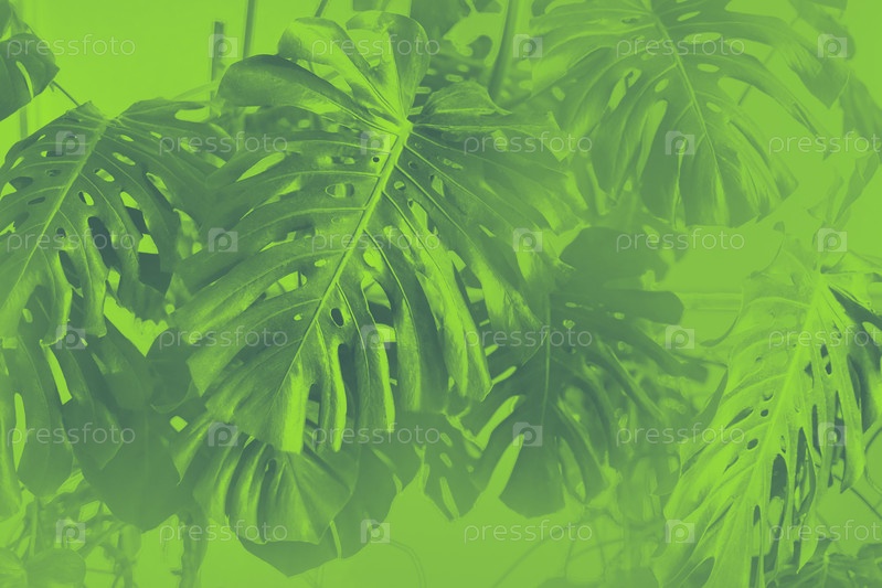 Тропические джунгли зеленые листья на фоне, лист Monstera Deliciosa на стене с неоновой зелени