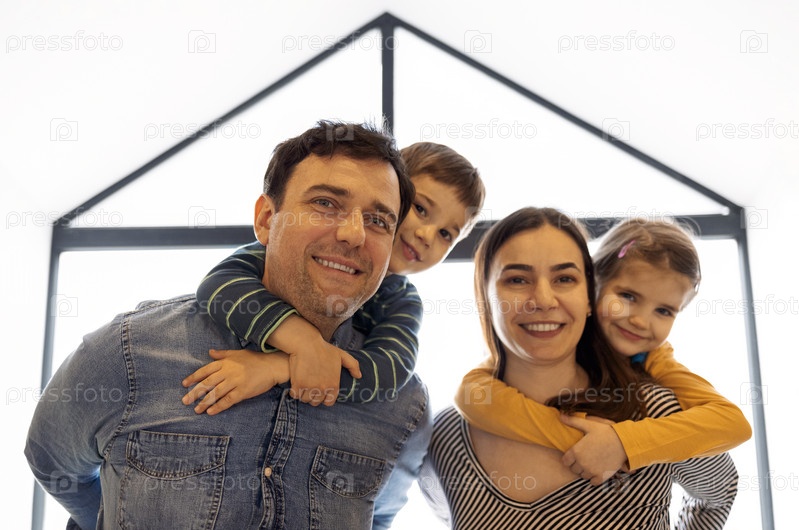 Счастливые родители с сыном и дочерью позируют в помещении