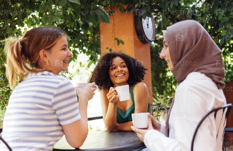 Многоэтническая группа девушек в повседневной одежде и традиционном хиджабе, развлекающихся на свежем воздухе