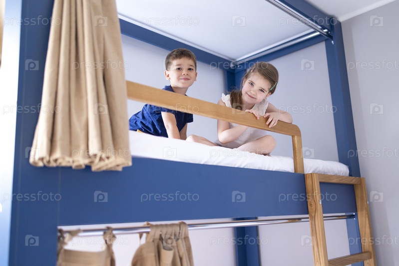 Кавказский маленький брат сидит на двухъярусной кровати и смотрит в камеру с широкой улыбкой