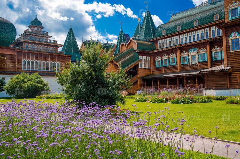 Городской ландшафт. Популярная туристическая достопримечательность. Визитная карточка Москвы. Царский деревянный дворец в Коломенском парке на фоне ярко-голубого неба, Москва, Россия