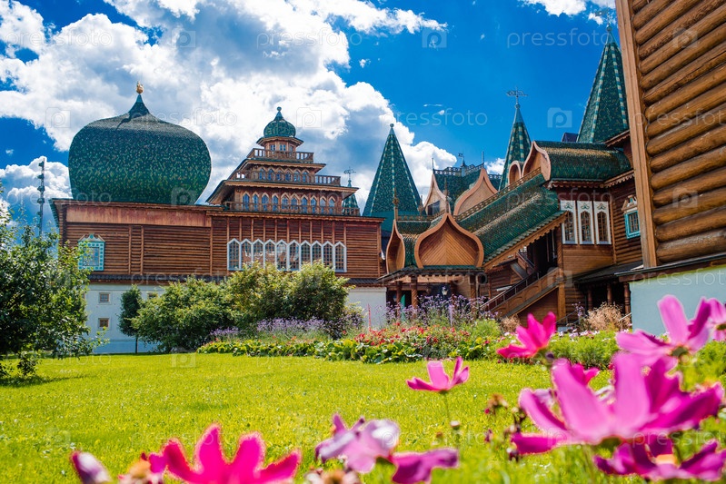 Городской ландшафт. Популярная туристическая достопримечательность. Визитная карточка Москвы. Царский деревянный дворец в Коломенском парке на фоне ярко-голубого неба, Москва, Россия
