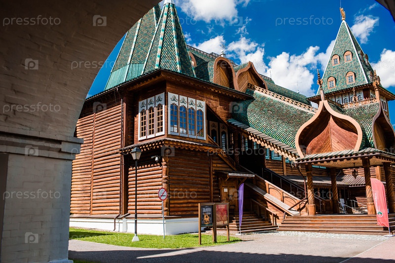 Городской ландшафт. Популярная туристическая достопримечательность. Визитная карточка Москвы. Царский деревянный дворец в Коломенском парке на фоне ярко-голубого неба, Москва, Россия