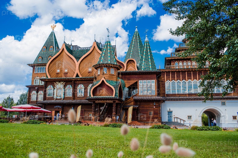 Городской ландшафт. Популярная туристическая достопримечательность. Визитная карточка Москвы. Царский деревянный дворец в Коломенском парке на фоне ярко-голубого неба, Москва, Россия