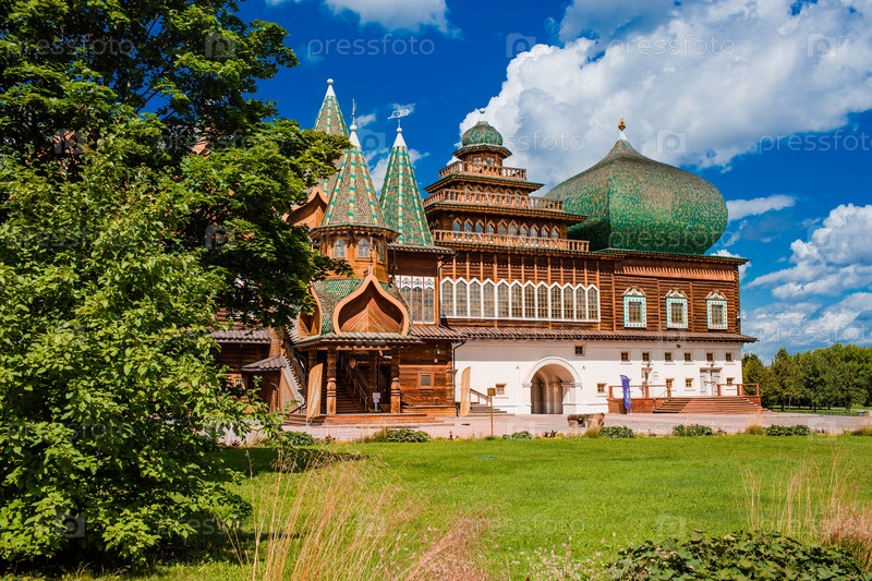 Городской ландшафт. Популярная туристическая достопримечательность. Визитная карточка Москвы. Царский деревянный дворец в Коломенском парке на фоне ярко-голубого неба, Москва, Россия