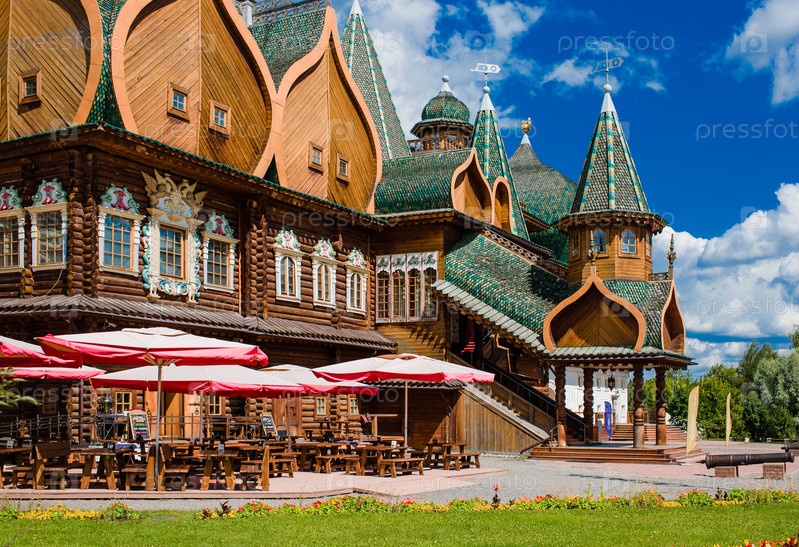 Городской ландшафт. Популярная туристическая достопримечательность. Визитная карточка Москвы. Царский деревянный дворец в Коломенском парке на фоне ярко-голубого неба, Москва, Россия