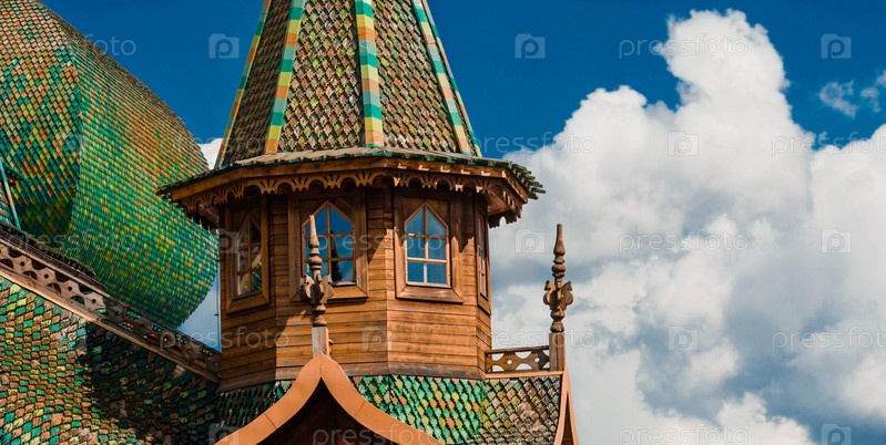 Городской ландшафт. Популярная туристическая достопримечательность. Визитная карточка Москвы. Царский деревянный дворец в Коломенском парке на фоне ярко-голубого неба, Москва, Россия