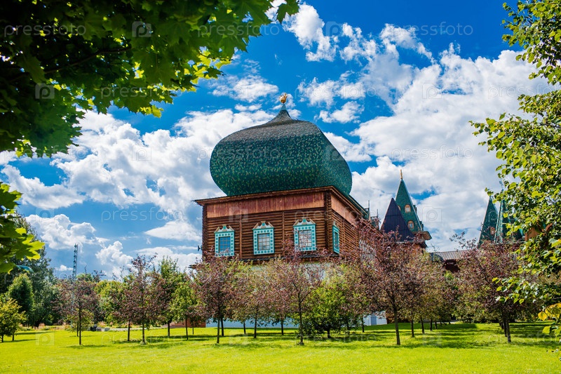 Городской ландшафт. Популярная туристическая достопримечательность. Визитная карточка Москвы. Царский деревянный дворец в Коломенском парке на фоне ярко-голубого неба, Москва, Россия