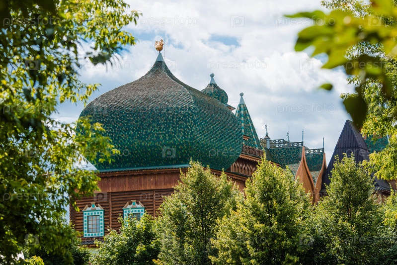 Городской ландшафт. Популярная туристическая достопримечательность. Визитная карточка Москвы. Царский деревянный дворец в Коломенском парке на фоне ярко-голубого неба, Москва, Россия