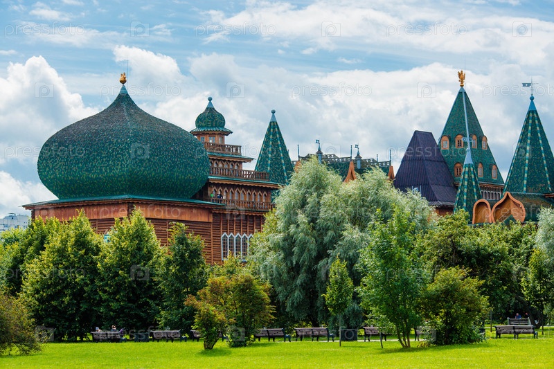 Городской ландшафт. Популярная туристическая достопримечательность. Визитная карточка Москвы. Царский деревянный дворец в Коломенском парке на фоне ярко-голубого неба, Москва, Россия