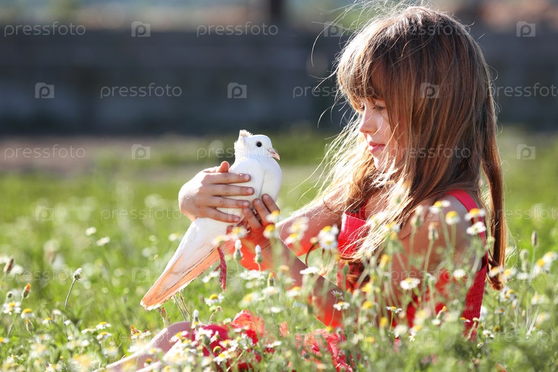 Девочка в красном платье держит белого голубя