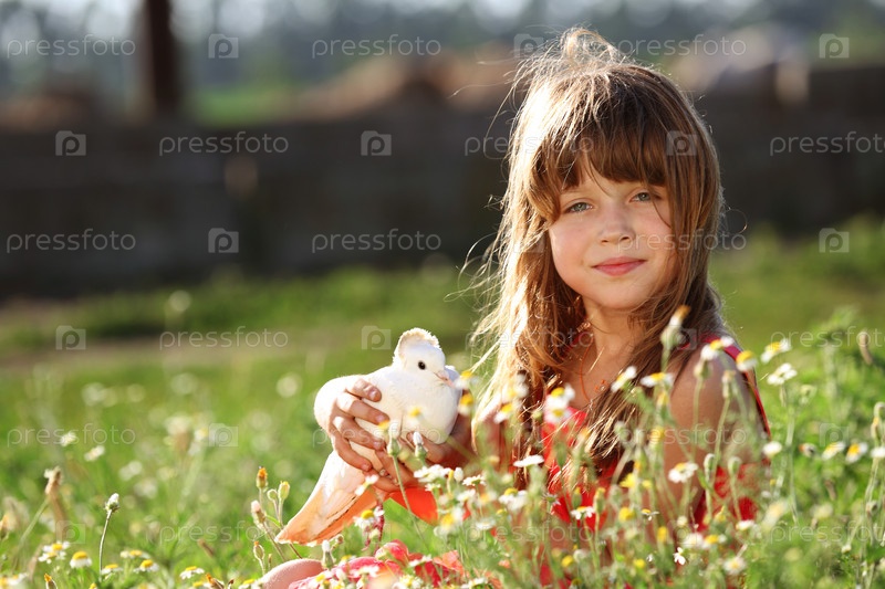 Девочка в красном платье держит белого голубя