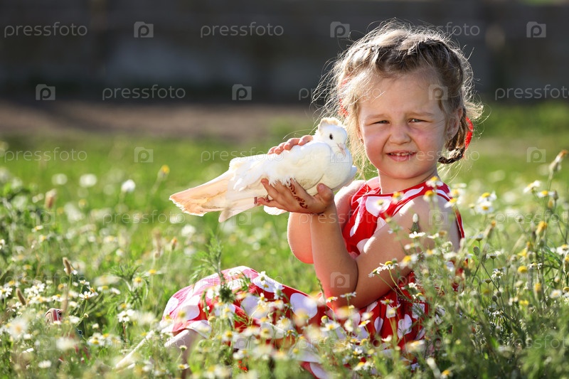 Девочка в красном платье держит белого голубя