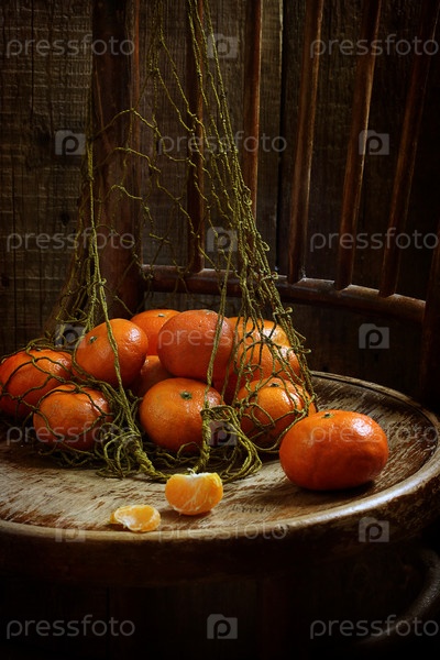 Мандарины в сетке на деревянном столе