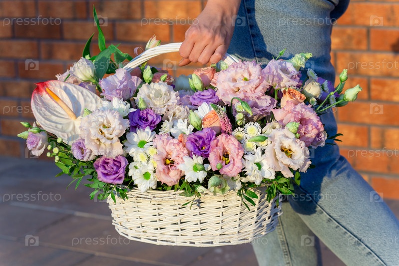 Женщина идет и держит большую и красивую плетеную корзину со свежими розами, эустомой и другими цветами