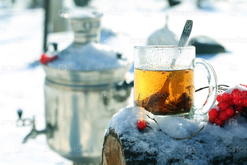 Натюрморт с самоваром и стаканом с чаем на зимнем дворе
