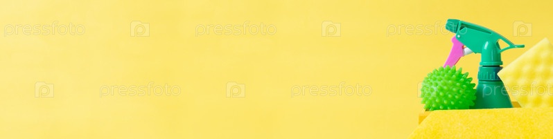 Набор для чистки на желтый. Зеленая бутылка с распылителем, шарик для стирки, губка и тряпка. Домашние инструменты. Веб-баннер с копией пространства