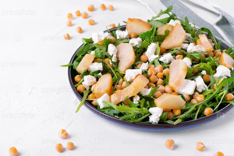 Салат с нутом, рукколой, карамелизированной грушей, сыром фета подается на керамической тарелке на белом столе