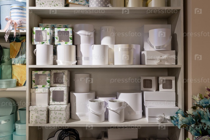 Крупный план декоративных коробок для упаковки цветов на полке в цветочном магазине. Малый бизнес. Современный интерьер цветочного магазина