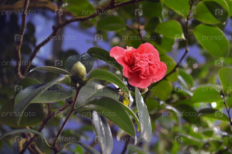 Цветок и бутон Камелии японской в Ботаническом саду
