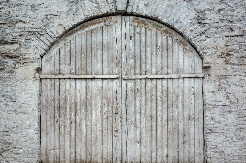 Старые деревянные ворота в каменной стене. Россия, город Оренбург