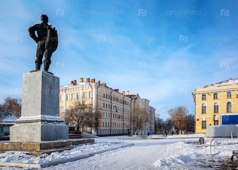 Оренбург, Россия - 07 декабря 2021 г.: Памятник Валерию Чкалову на набережной, зимний городской пейзаж